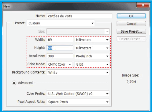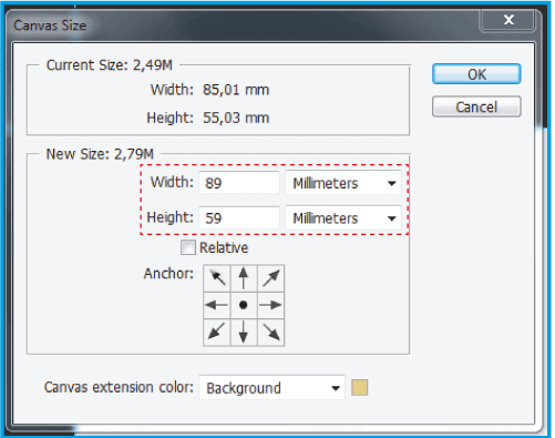.Sadaļā (attēls zemāk) norādiet dokumenta izmēru, neaizmirstot pievienot vēl 4 mm augstumā un platumā, lai izveidotu apgriešanu.