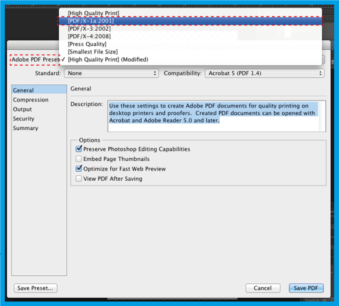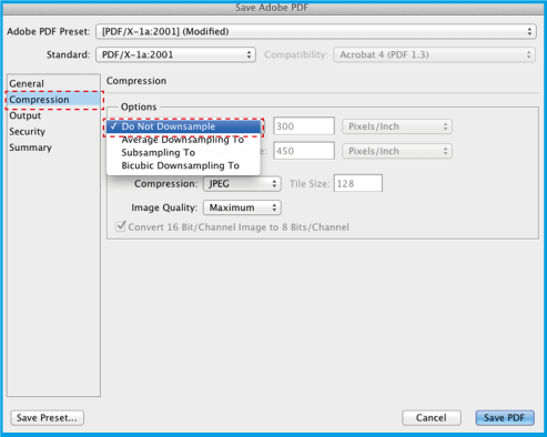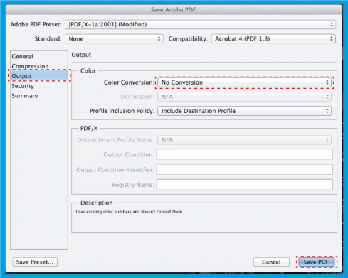 .Pēc tam atlasiet un labajā pusē . Šī opcija nodrošina, ka saglabājat failu bez jebkādām krāsu uzvednēm, un pēc tam noklikšķiniet uz Saglabāt iepriekšējo iestatījumu..., saglabājiet šos PDF iepriekšējos iestatījumus ar jebkuru vēlamo nosaukumu, lai .